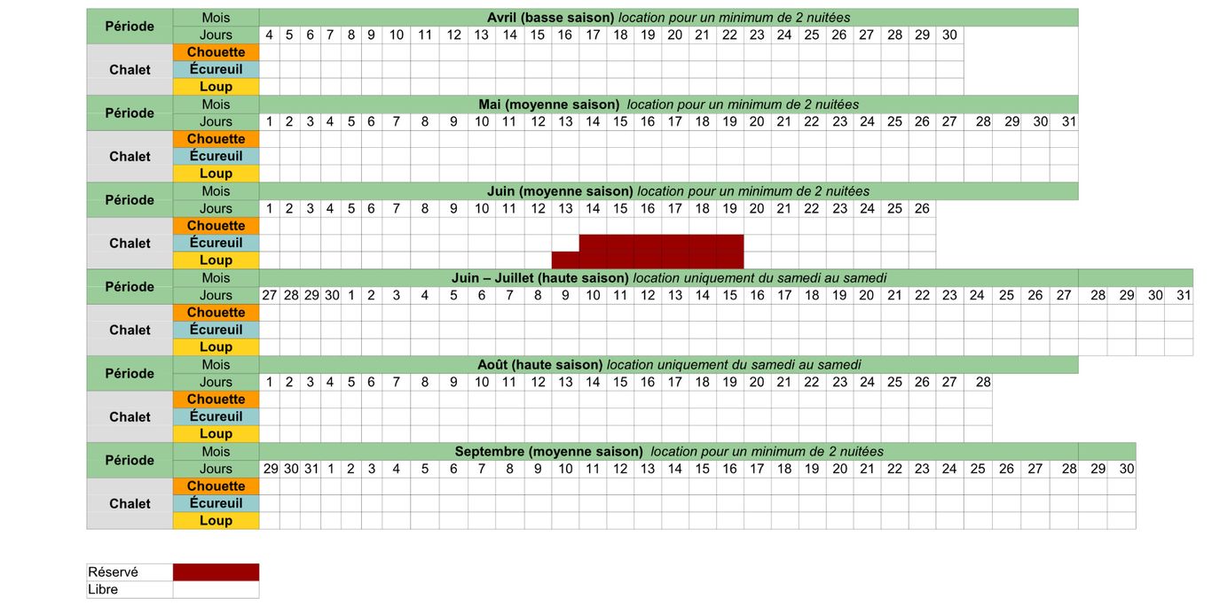 Les tarifs ci-dessous sont hors taxe de séjour (0,99€/personne majeur/nuitée) et options (liste des prestations et tarifs ci-dessous).